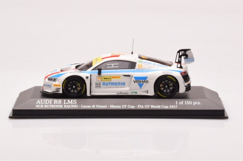 The Audi R8 LMS #11 HCB Rutronik Racing L. di Grassi FIA GT World Cup Macau 2016 Minichamps 1:43 is crafted from Diecast. Die-cast zinc alloy body with detailed plastic parts, rubber tires, and high-quality paint finish. Die-cast models are known for their weight, durability, and realistic feel.
