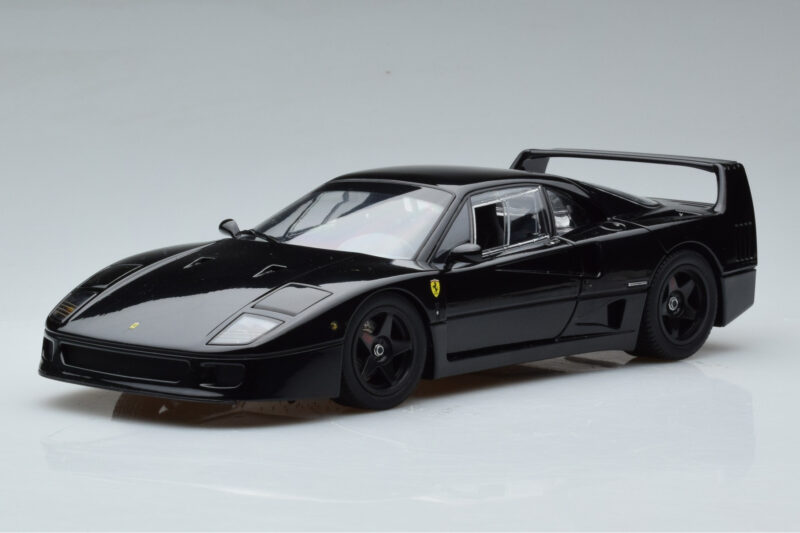 The Ferrari F40 Lightweight Black Kyosho 1:18 is crafted from Diecast. Die-cast zinc alloy body with detailed plastic parts, rubber tires, and high-quality paint finish. Die-cast models are known for their weight, durability, and realistic feel.