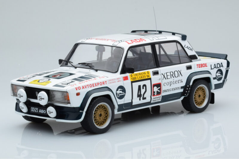 The Lada 2105 VFTS #42 S. Brundza Rally 1000 Lakes 1984 IXO 1:18 is crafted from Diecast. Die-cast zinc alloy body with detailed plastic parts, rubber tires, and high-quality paint finish. Die-cast models are known for their weight, durability, and realistic feel.