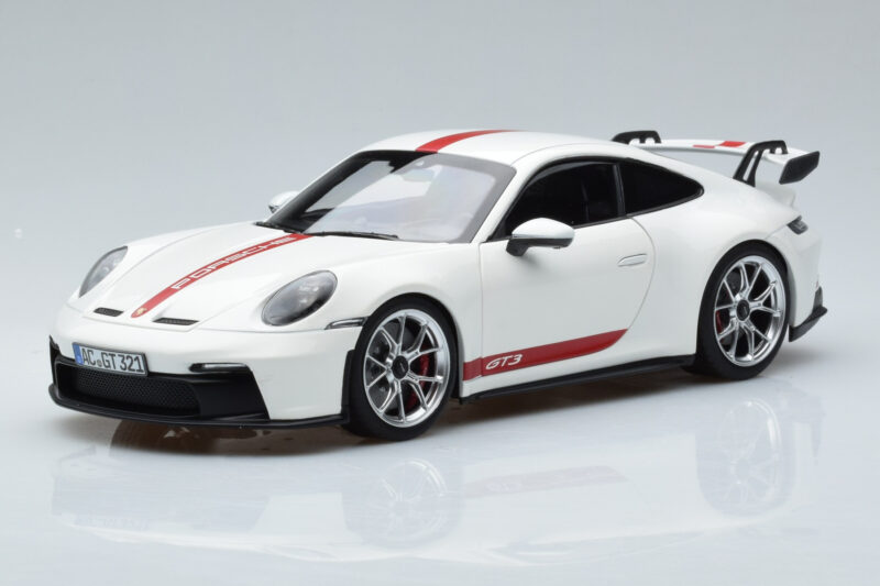 A 1:18 scale model measures approximately 25-28 cm (approximately 10-11 inches). The Porsche 911 992 GT3 White Norev 1:18 is perfect for display in a glass cabinet or on a shelf.