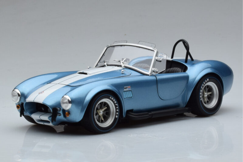 The Shelby Cobra 427 S/C Light Blue Kyosho 1:18 is crafted from Diecast. Die-cast zinc alloy body with detailed plastic parts, rubber tires, and high-quality paint finish. Die-cast models are known for their weight, durability, and realistic feel.
