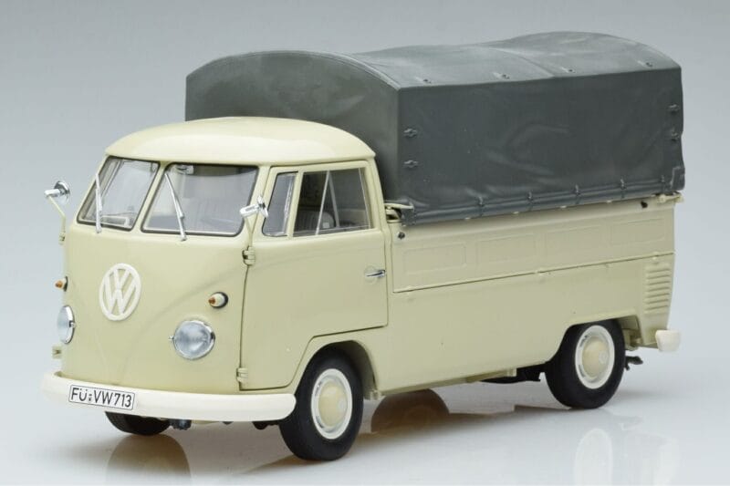 The Volkswagen T1b Pickup Schuco 1:18 is crafted from Diecast. Die-cast zinc alloy body with detailed plastic parts, rubber tires, and high-quality paint finish. Die-cast models are known for their weight, durability, and realistic feel.