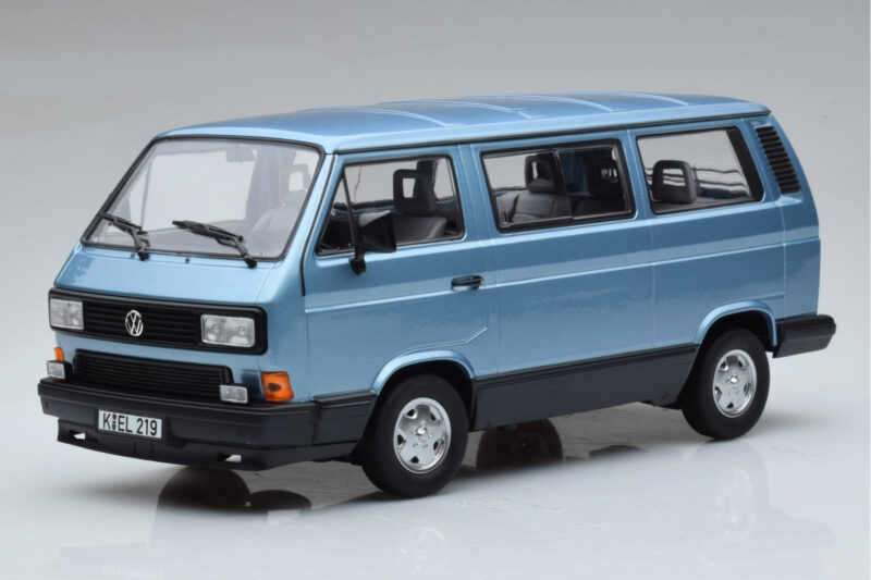 A 1:18 scale model measures approximately 25-28 cm (approximately 10-11 inches). The Volkswagen T3 Multivan Blue Norev 1:18 is perfect for display in a glass cabinet or on a shelf.
