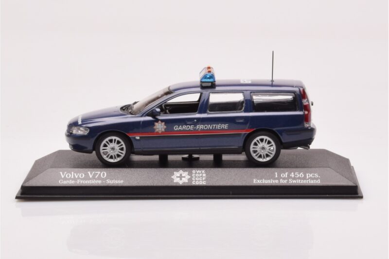 The Volvo V70 Garde Frontiere Suisse Minichamps 1:43 is crafted from Diecast. Die-cast zinc alloy body with detailed plastic parts, rubber tires, and high-quality paint finish. Die-cast models are known for their weight, durability, and realistic feel.
